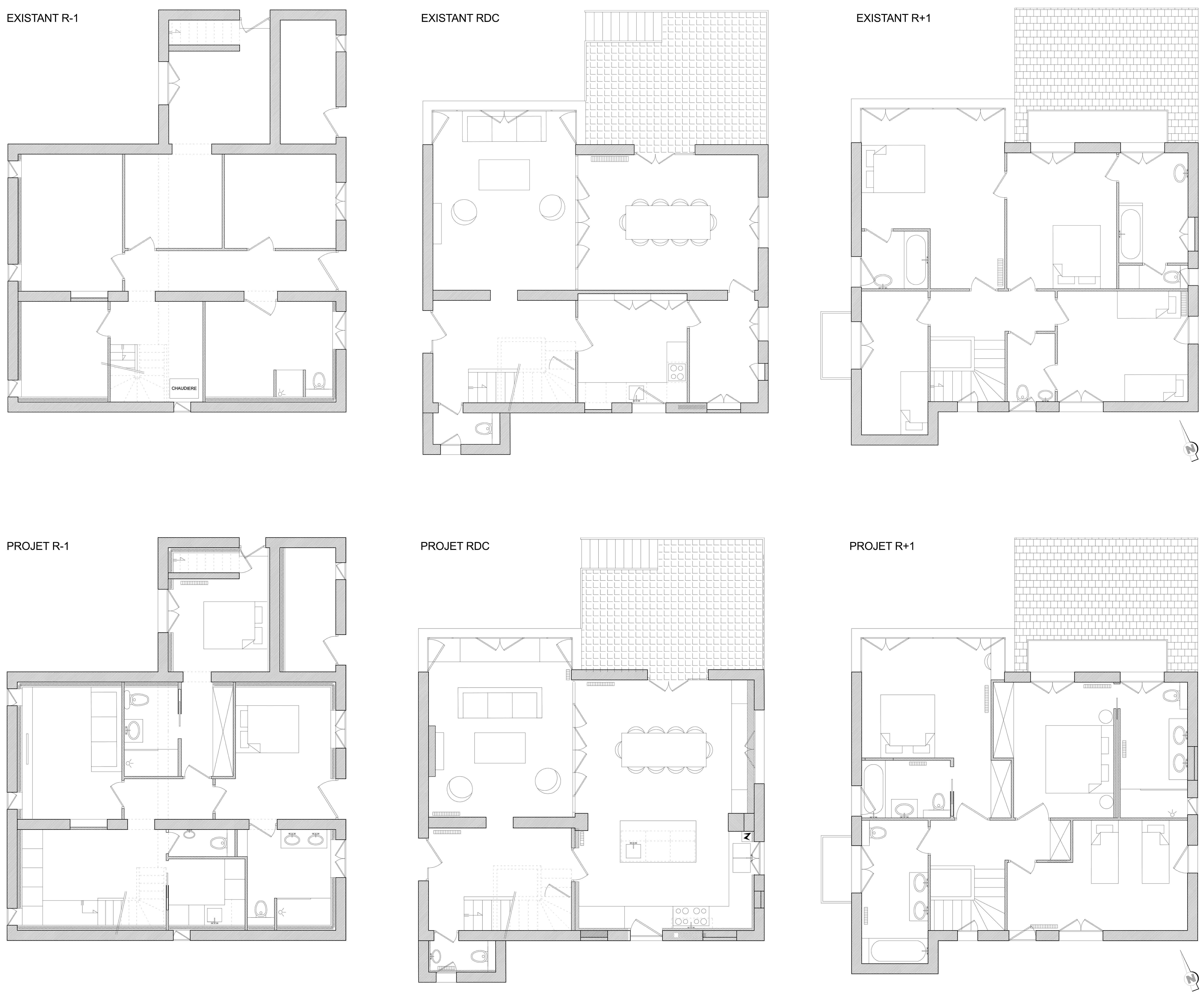 Le 1er étage a été entièrement modifié pour accueillir l’espace nuit principal avec 3 chambres et 3 salles de bain. Toutes les portes intérieures d’époque ont été réemployées après rénovation.