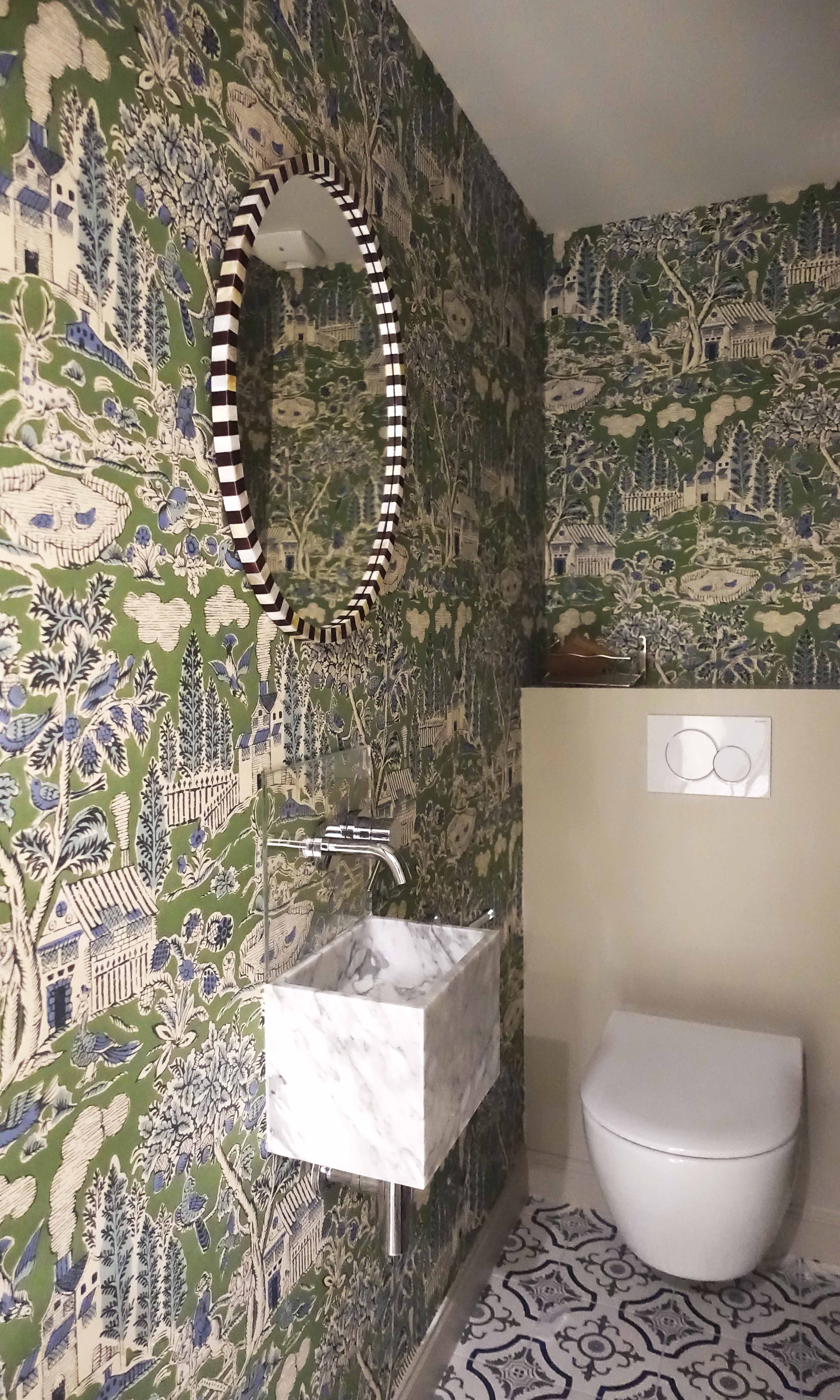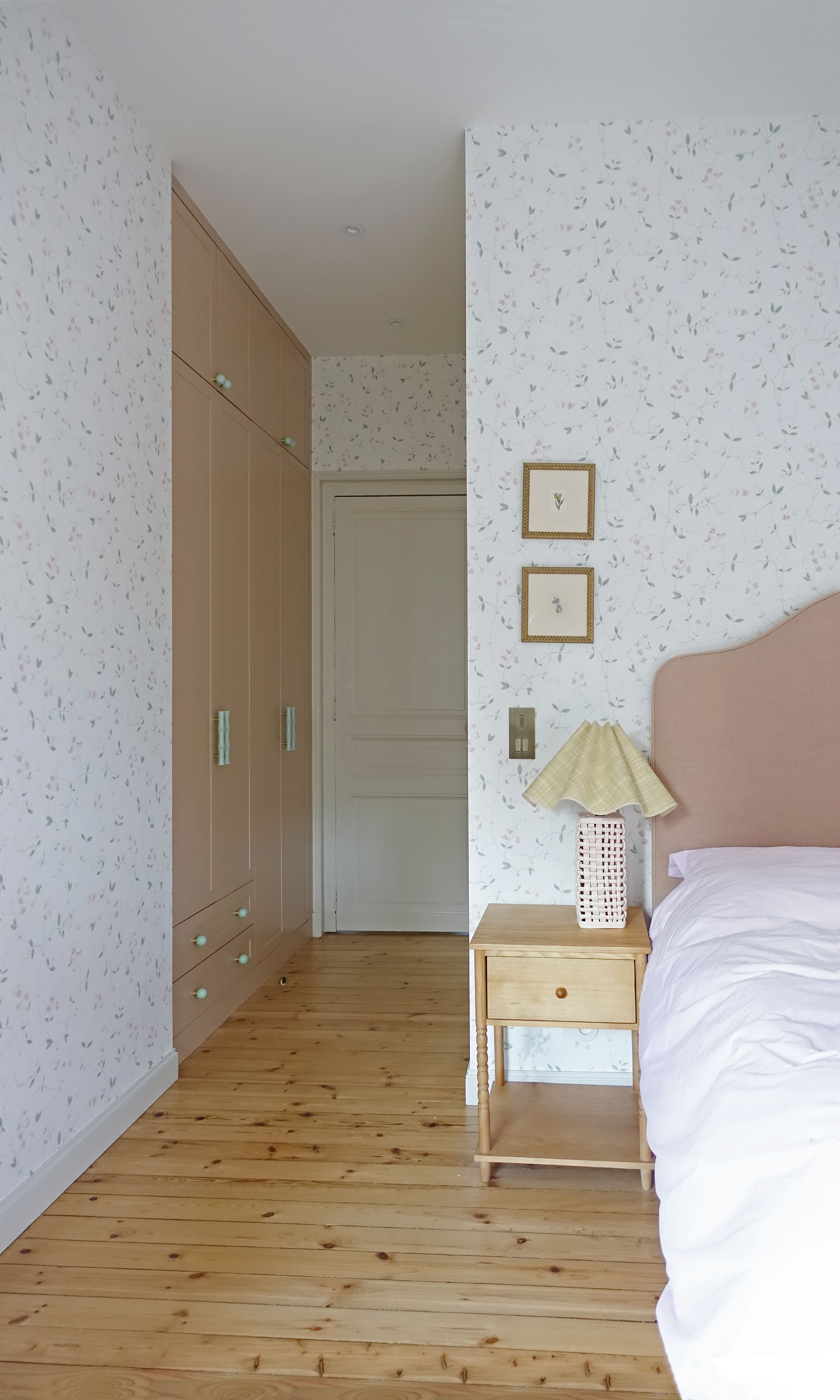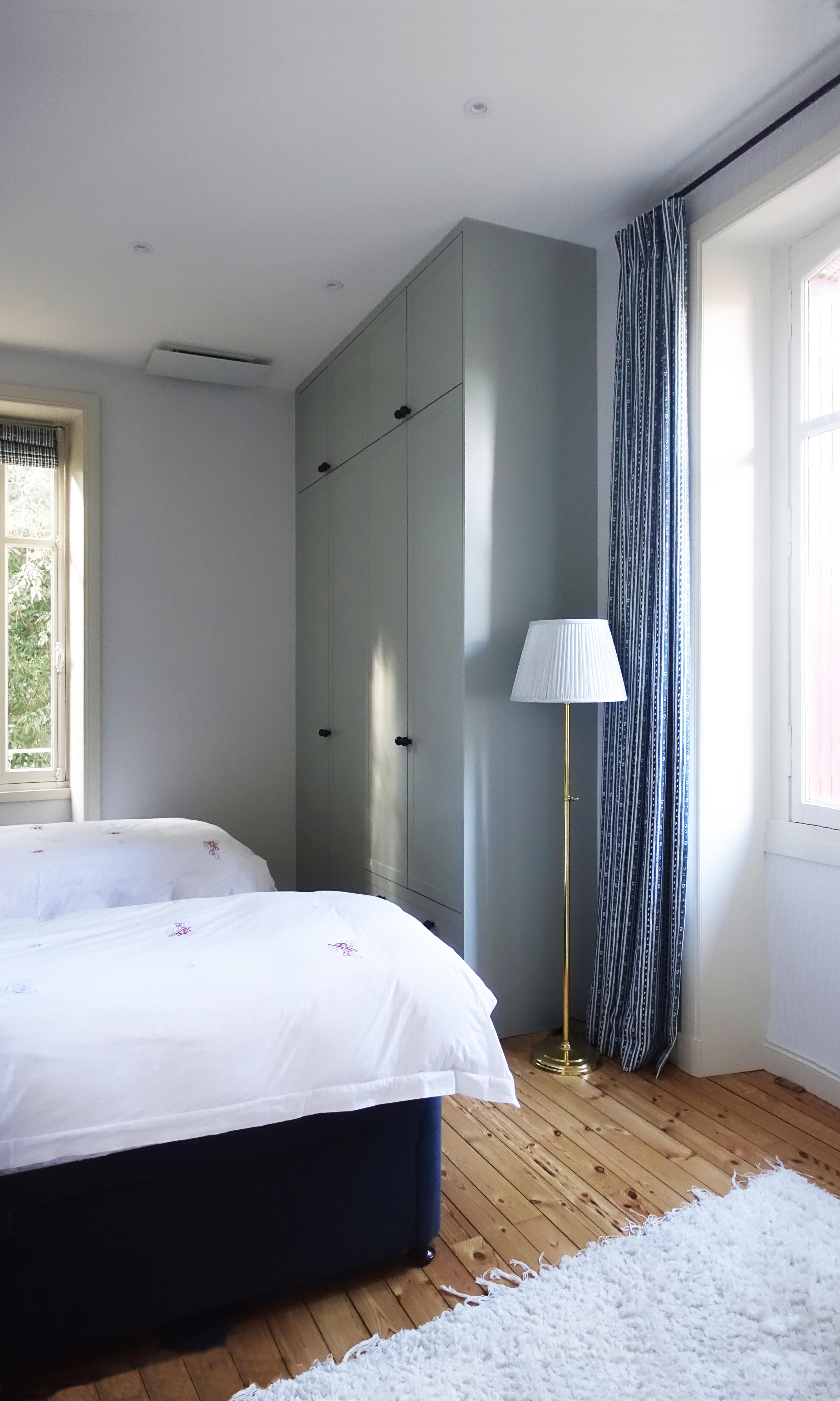 La maison existante comporte au RDC une entrée, des WC et un escalier. Une porte donne sur un garage accessible depuis la rue, il a été transformé en partie en buanderie. Le premier étage dispose d’un vaste palier avec de grands placards, qui dessert deux chambres, une salle de bain et des WC. Le deuxième étage sous les combles comprend lui aussi deux chambres, une salle d’eau et des WC.