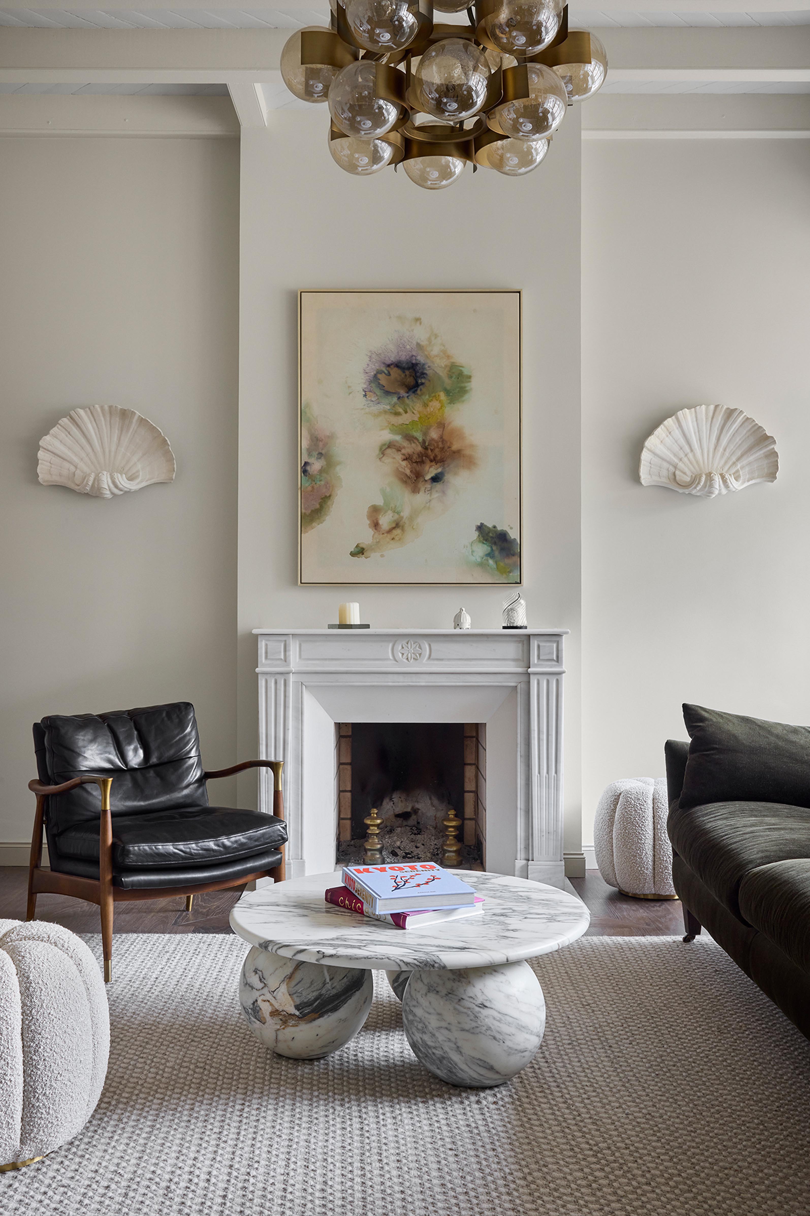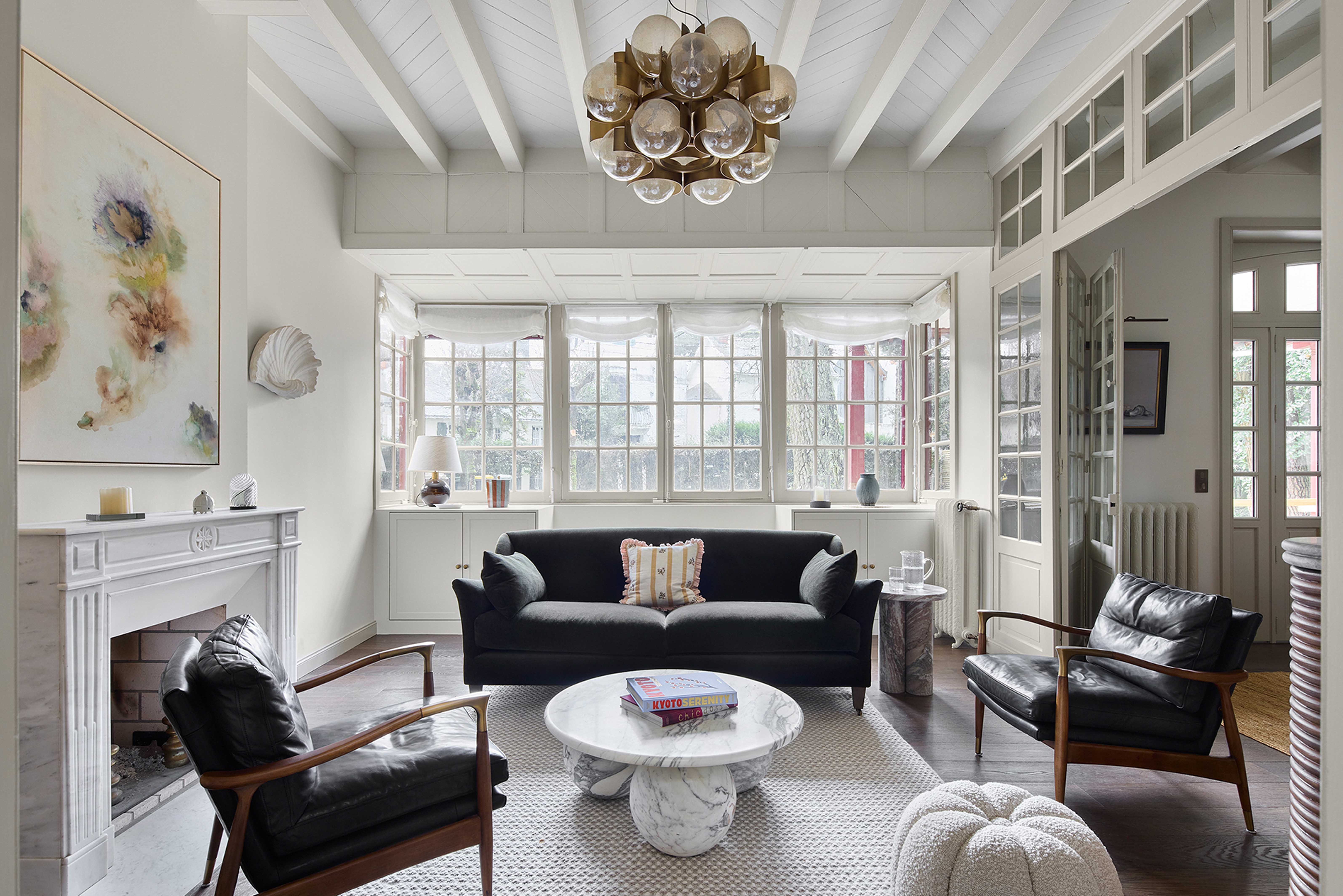 Création d’une cheminée en marbre et mise en valeur du bow-window avec une de banquette sur mesure et des rangements intégrés.