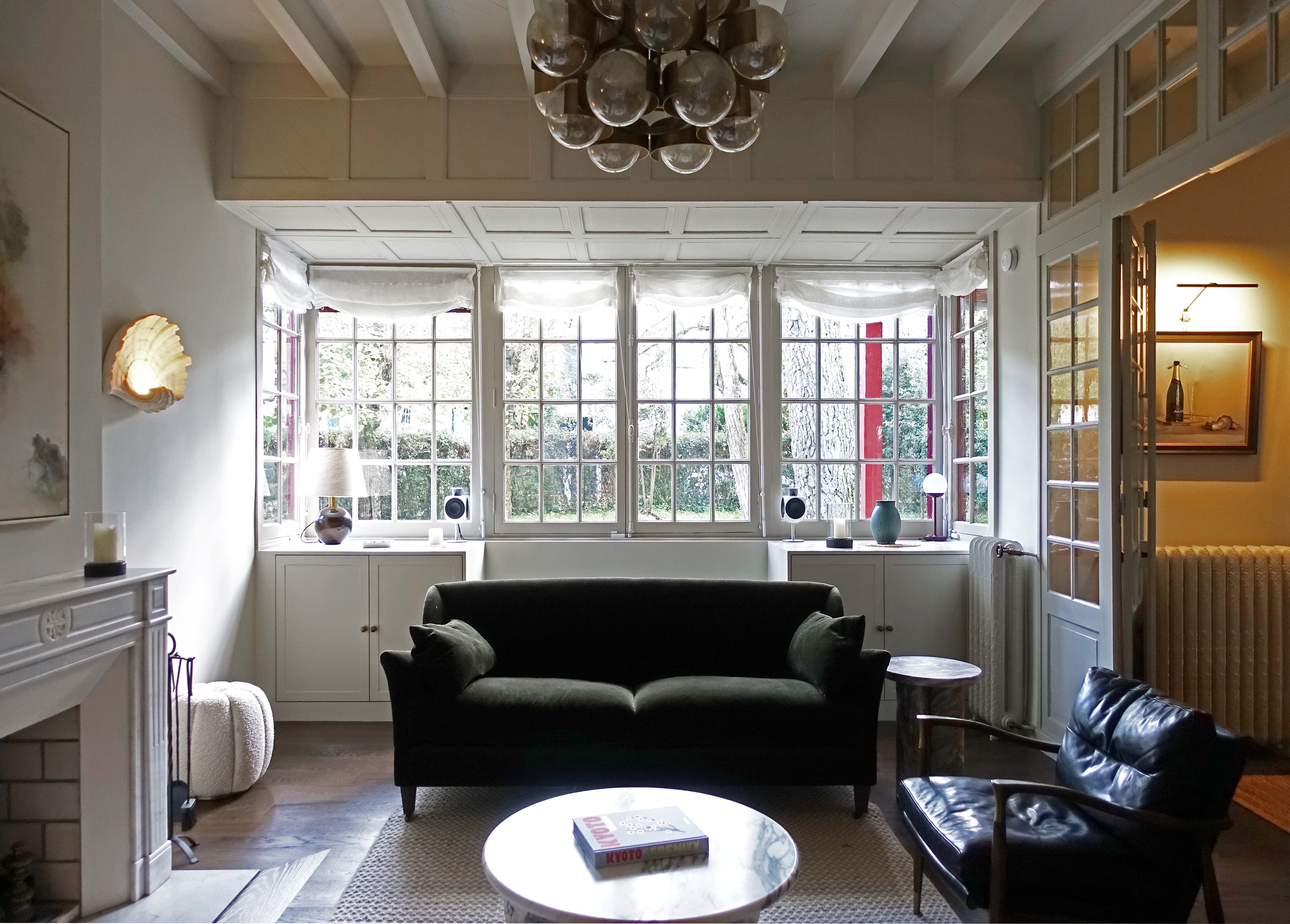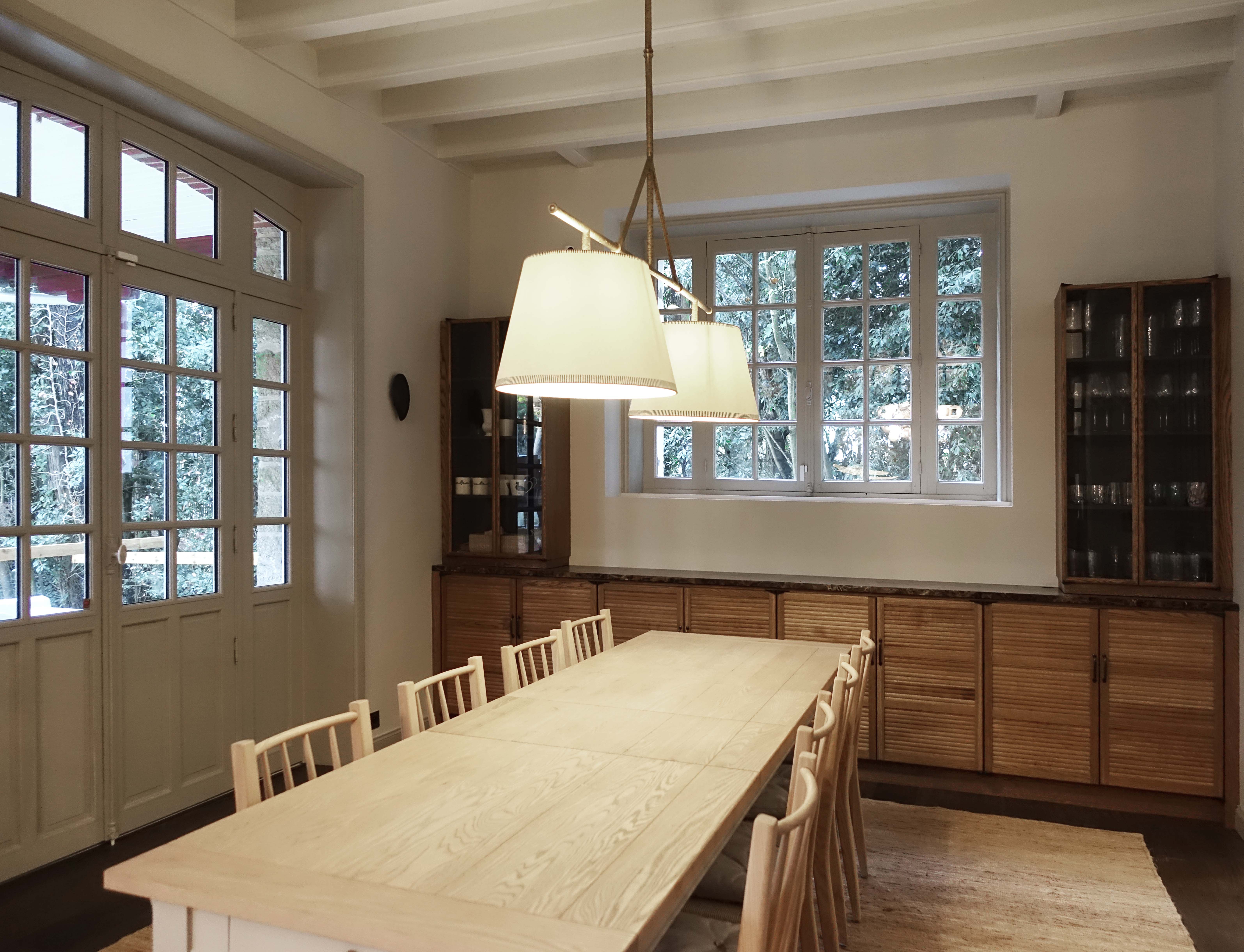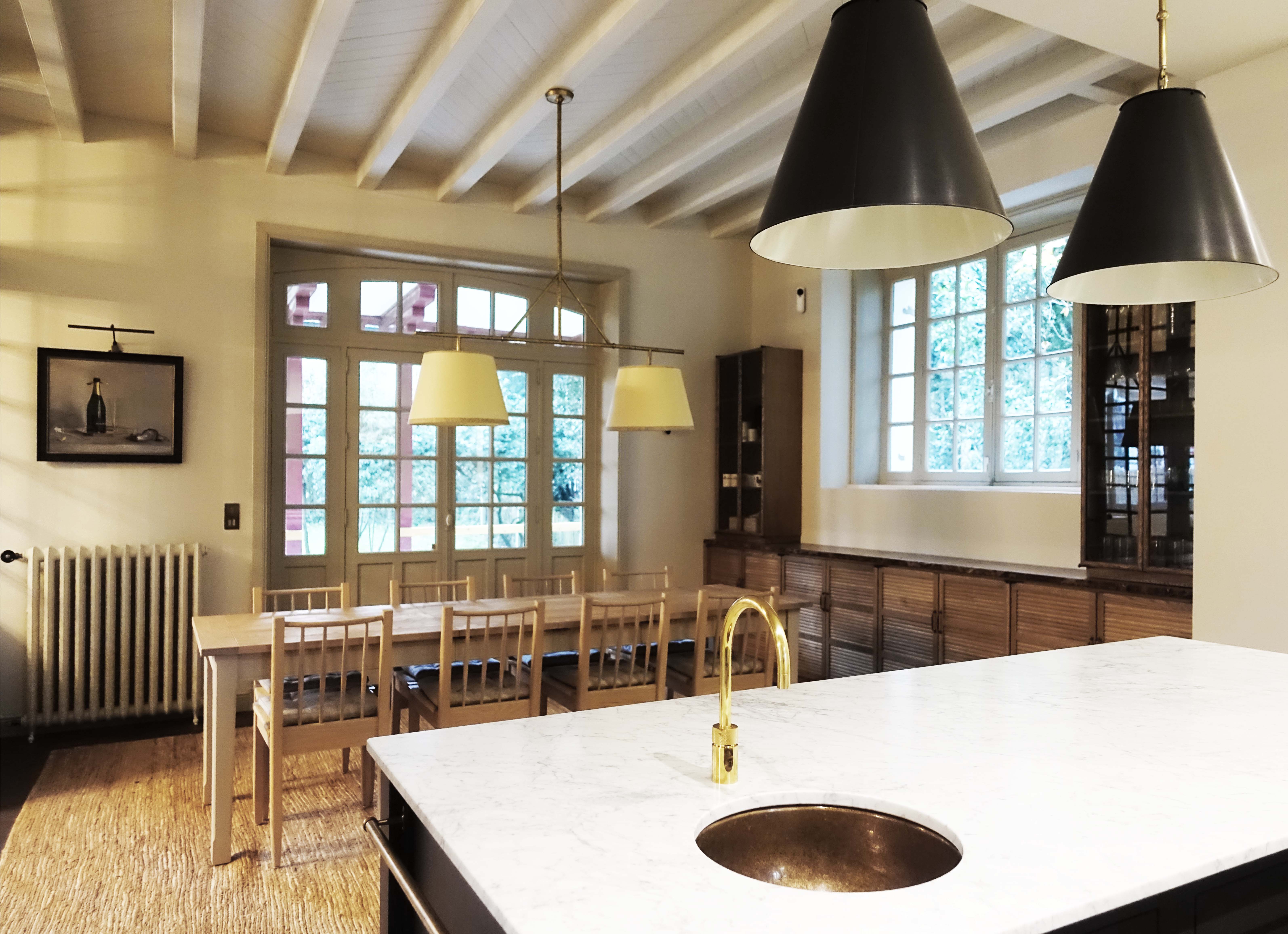 Une extension en « L » a été créée dans le prolongement de la maison pour que le séjour, la salle à manger et la cuisine soient au RDC et qu’elles bénéficient d’un beau volume lumineux ouvert sur un patio et un grand jardin.