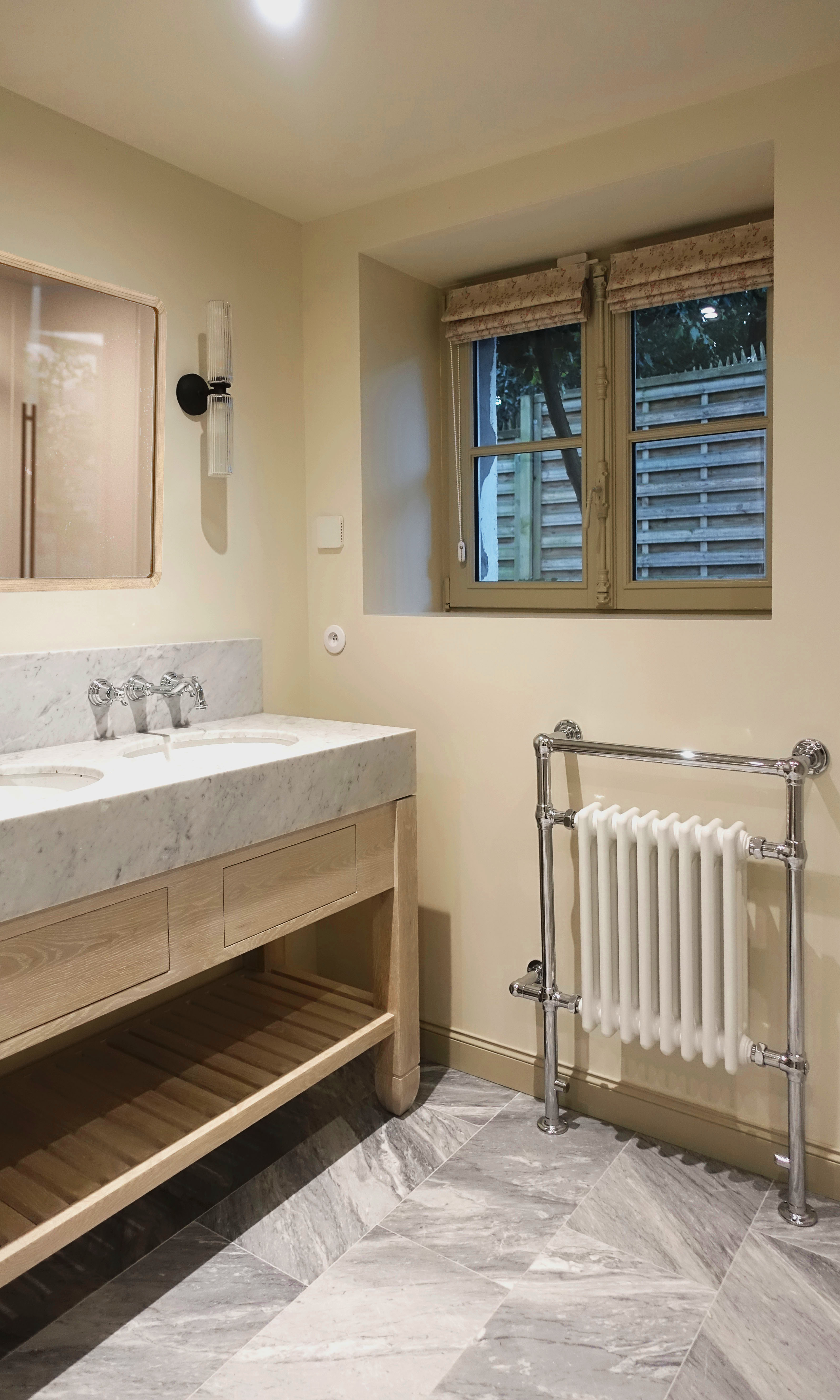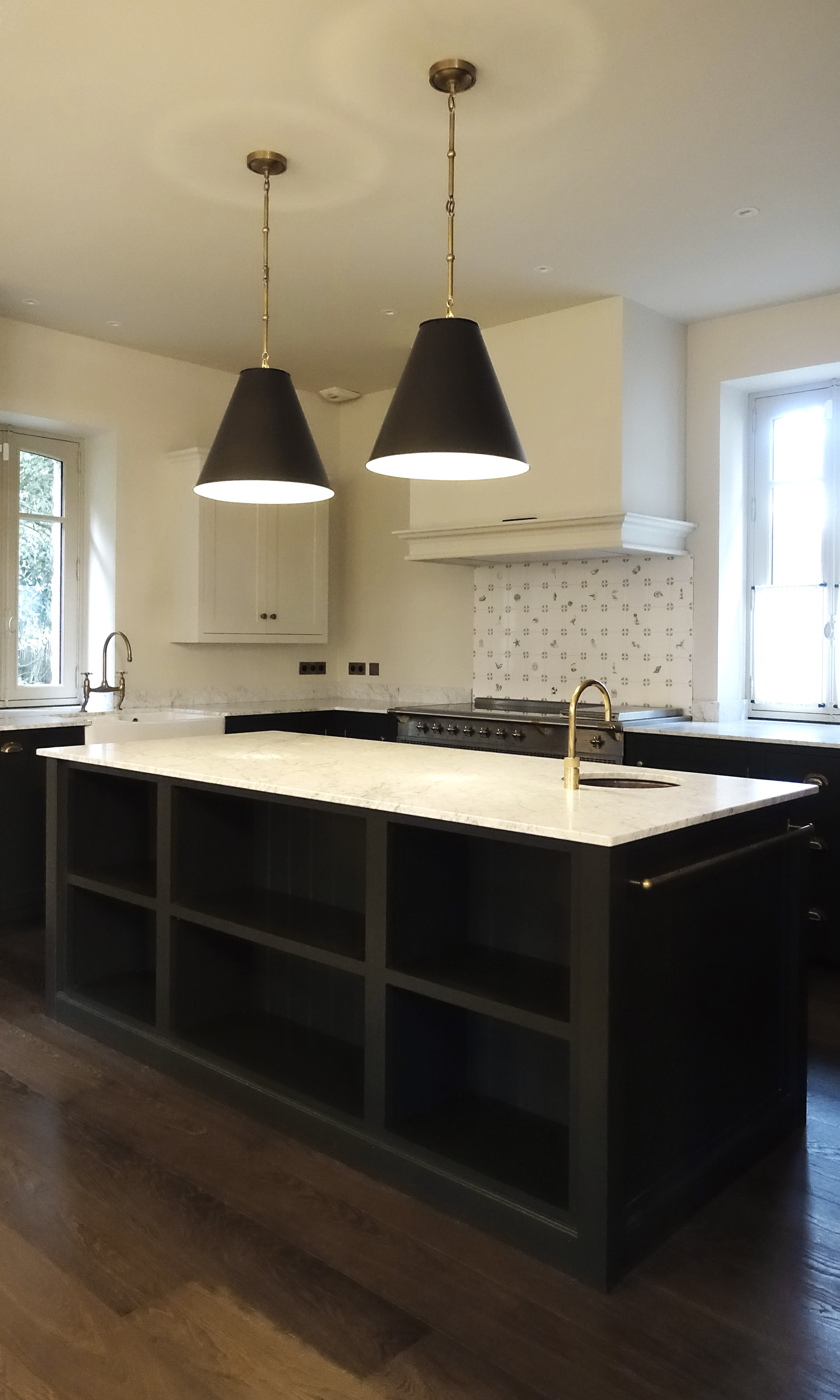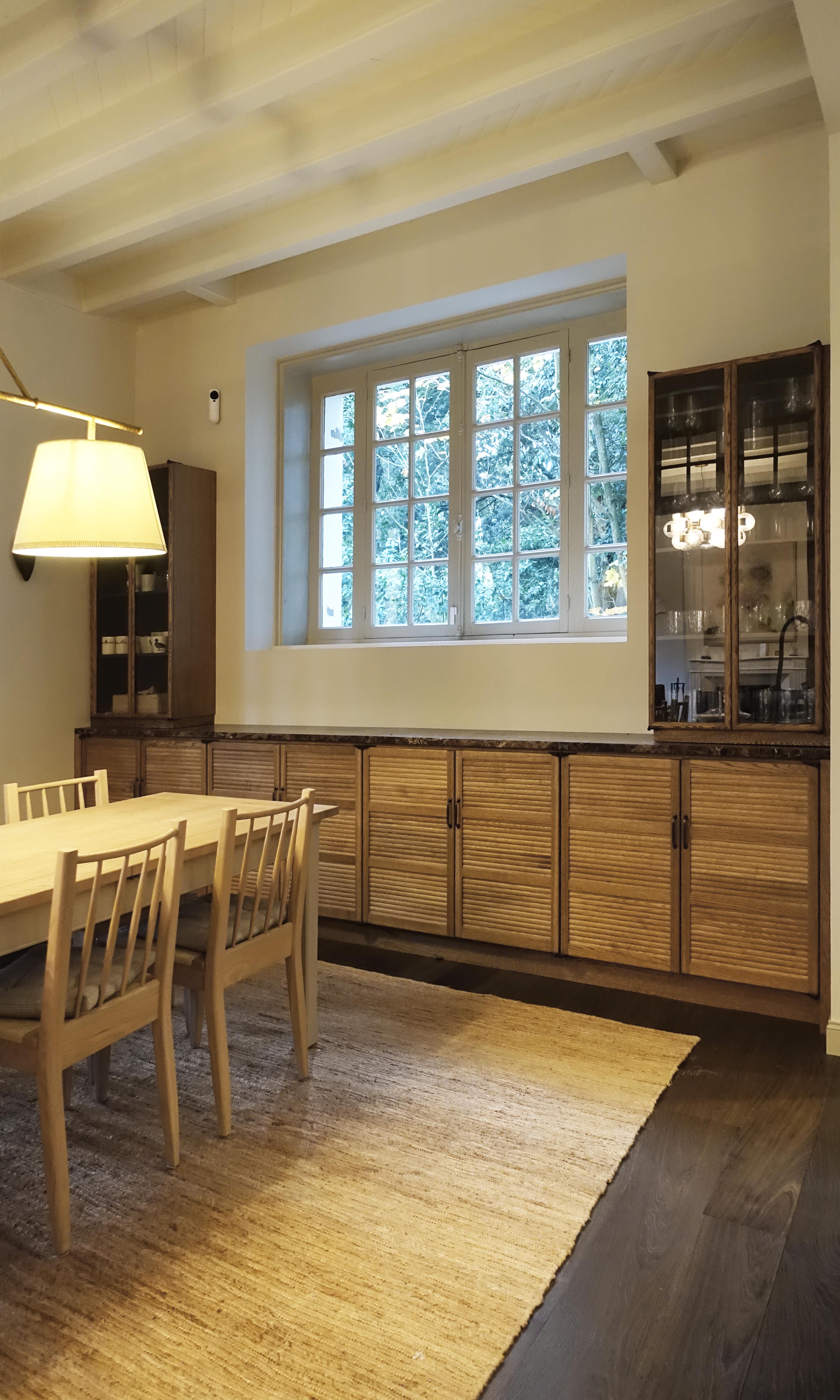 Une extension en « L » a été créée dans le prolongement de la maison pour que le séjour, la salle à manger et la cuisine soient au RDC et qu’elles bénéficient d’un beau volume lumineux ouvert sur un patio et un grand jardin.