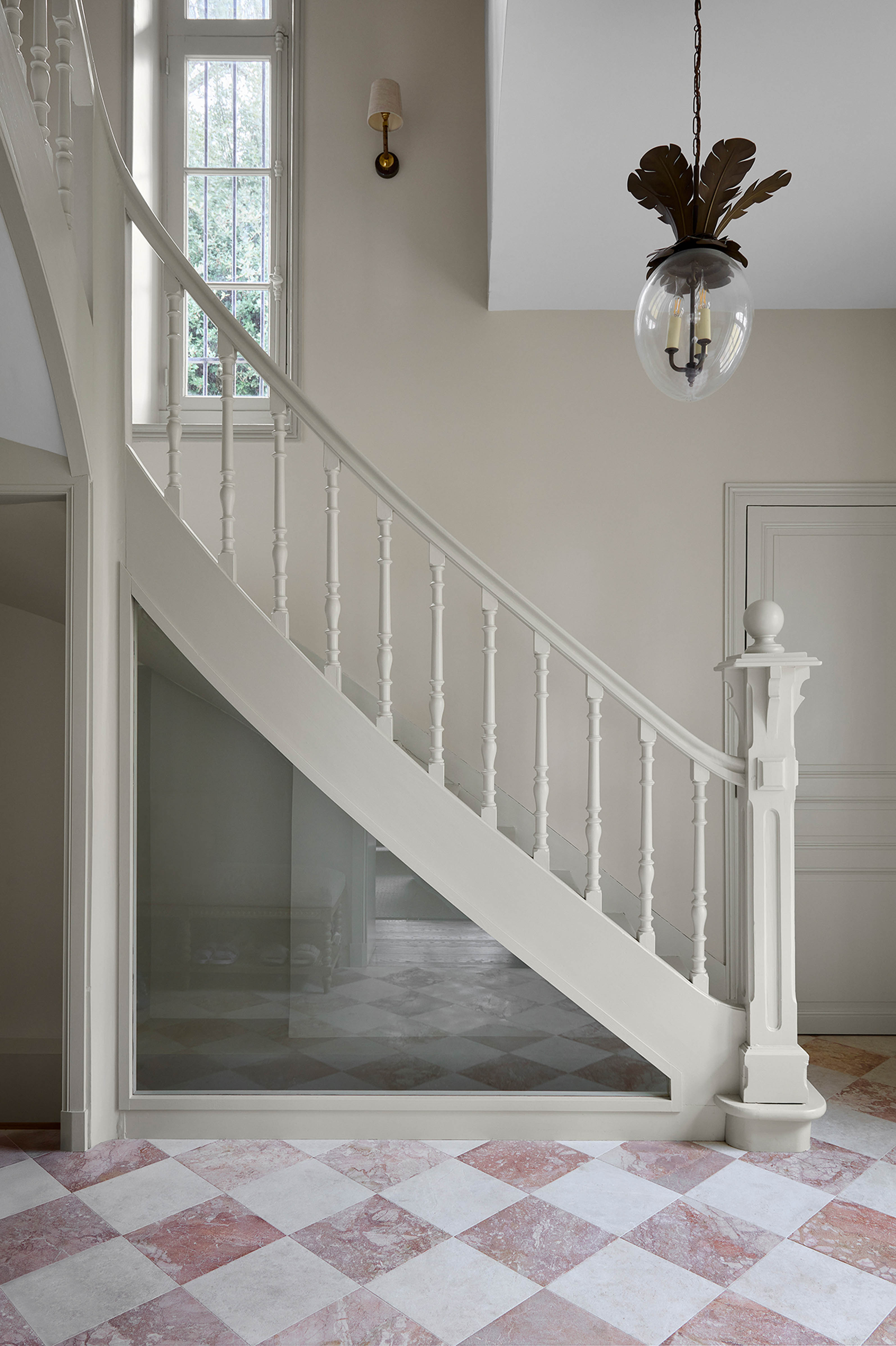 Dans l’entrée, une paroi vitrée sur l’escalier existant a été imaginée pour apporter de la lumière au rez-de-jardin.