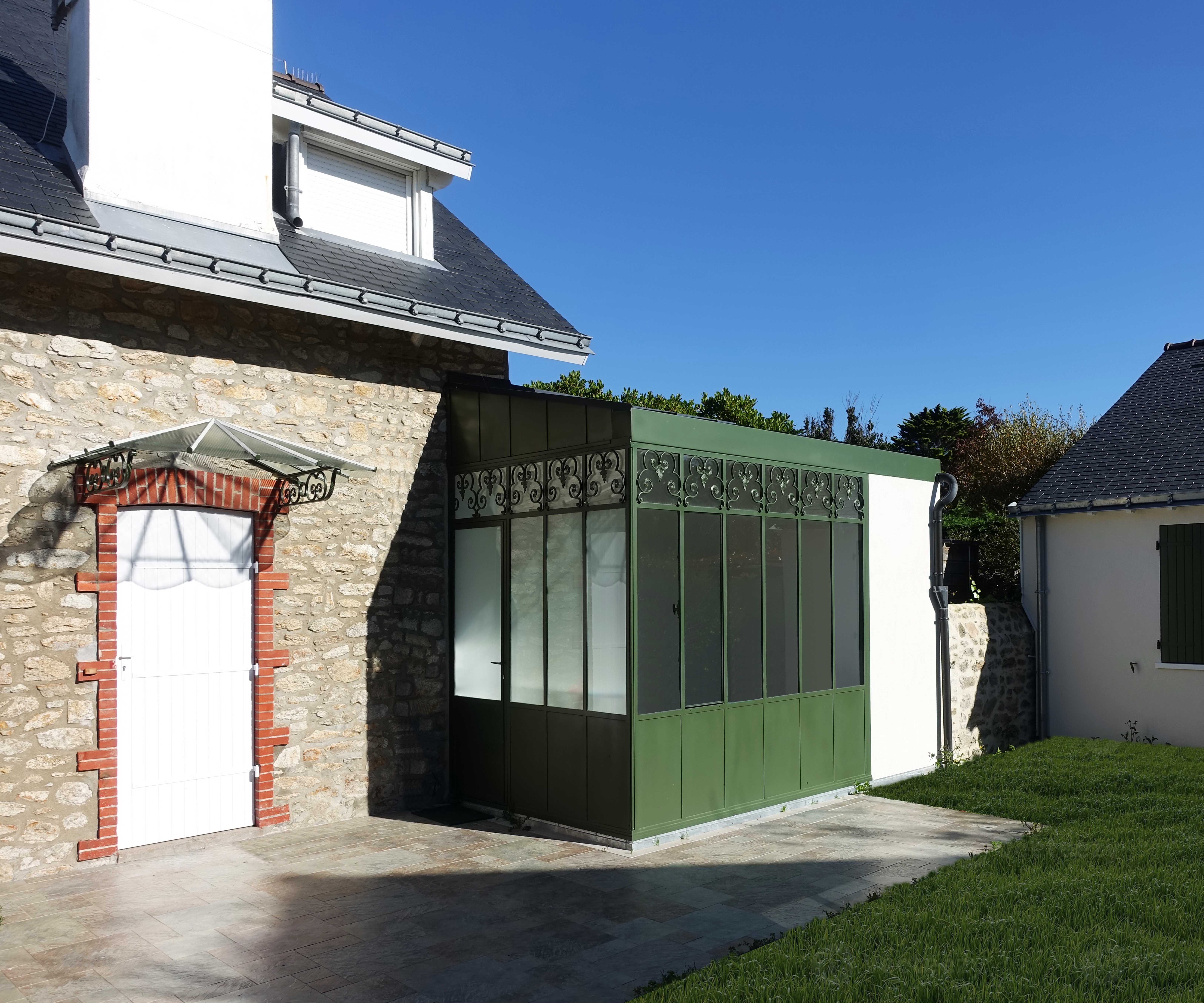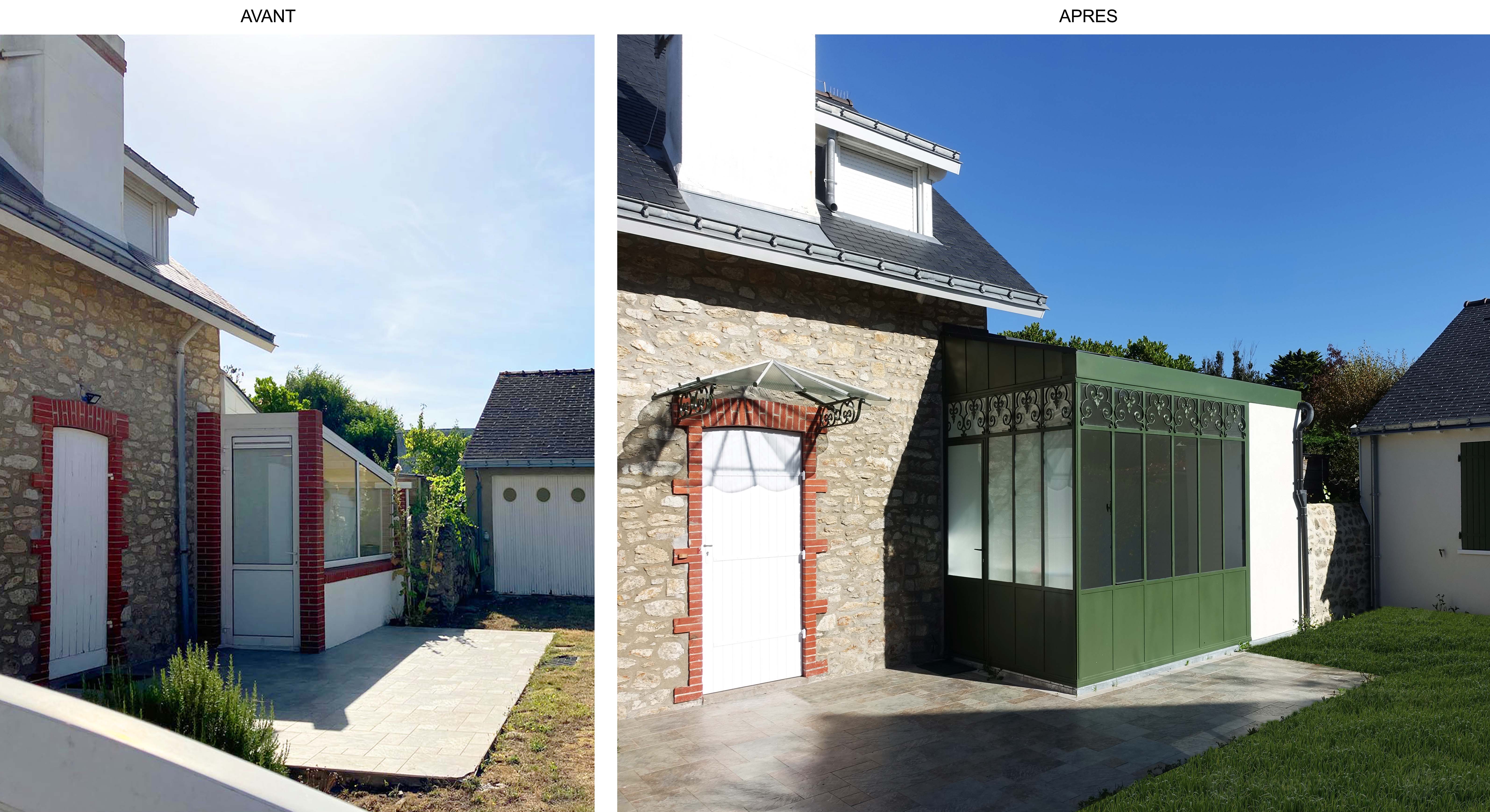 Une extension en « L » a été créée dans le prolongement de la maison pour que le séjour, la salle à manger et la cuisine soient au RDC et qu’elles bénéficient d’un beau volume lumineux ouvert sur un patio et un grand jardin.