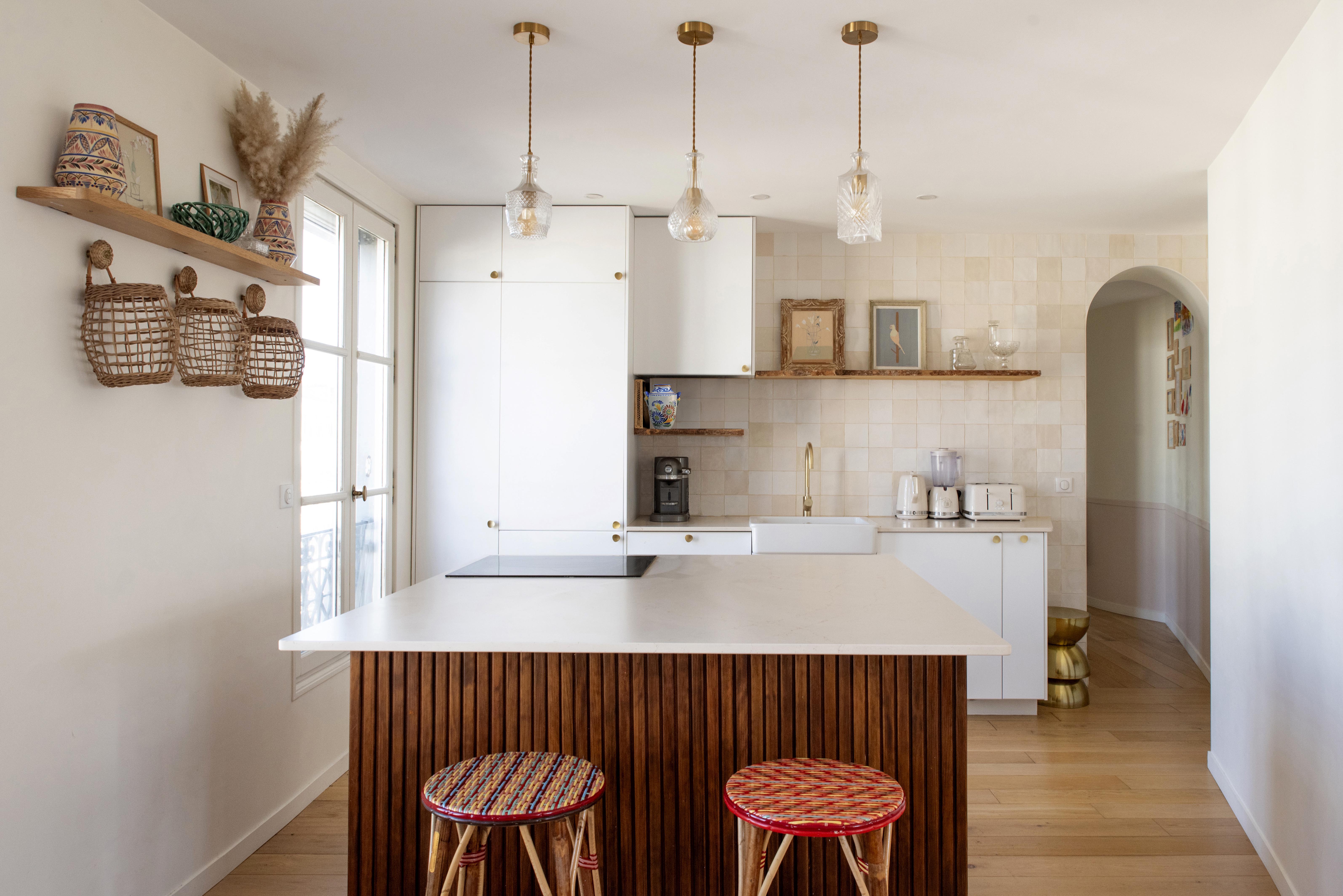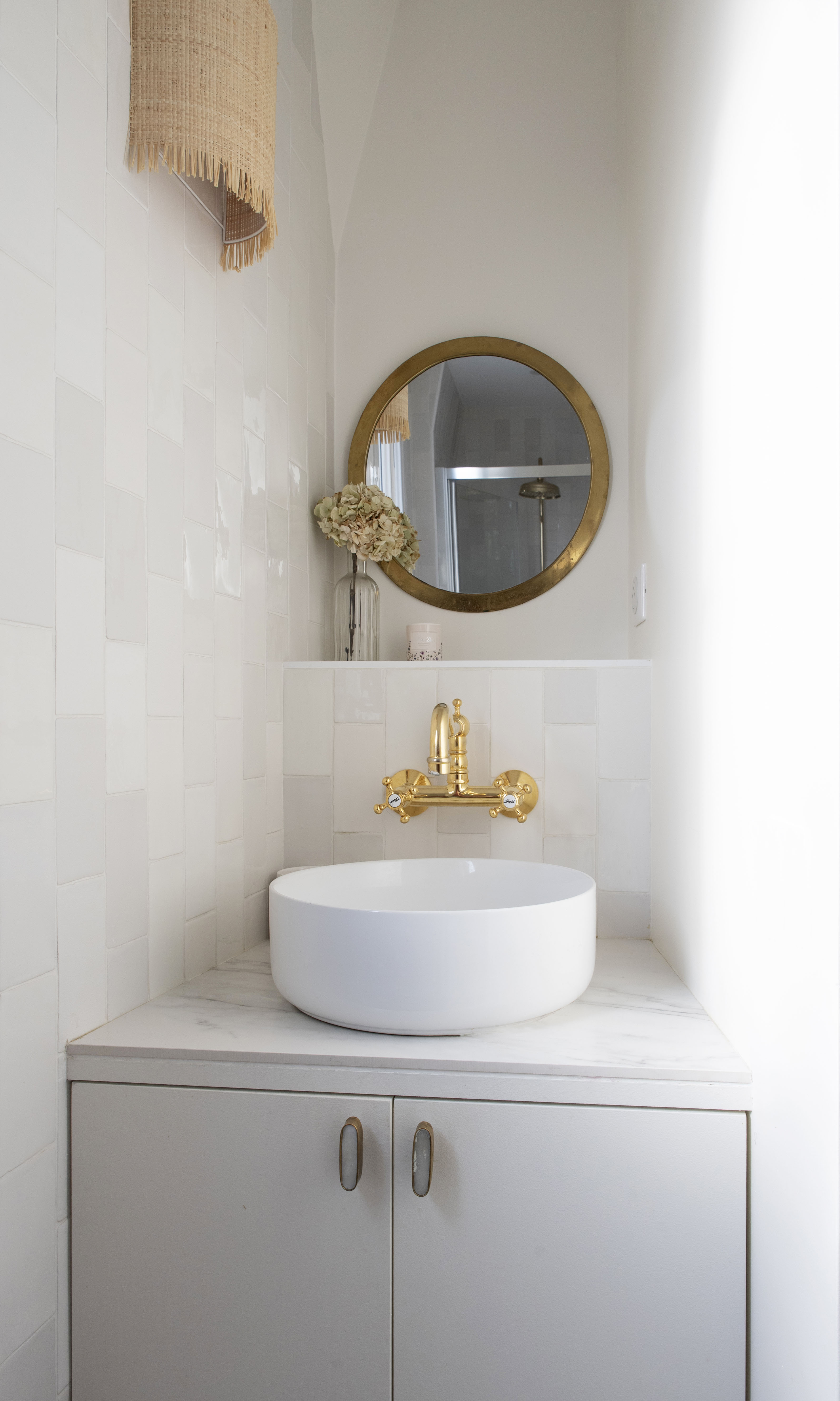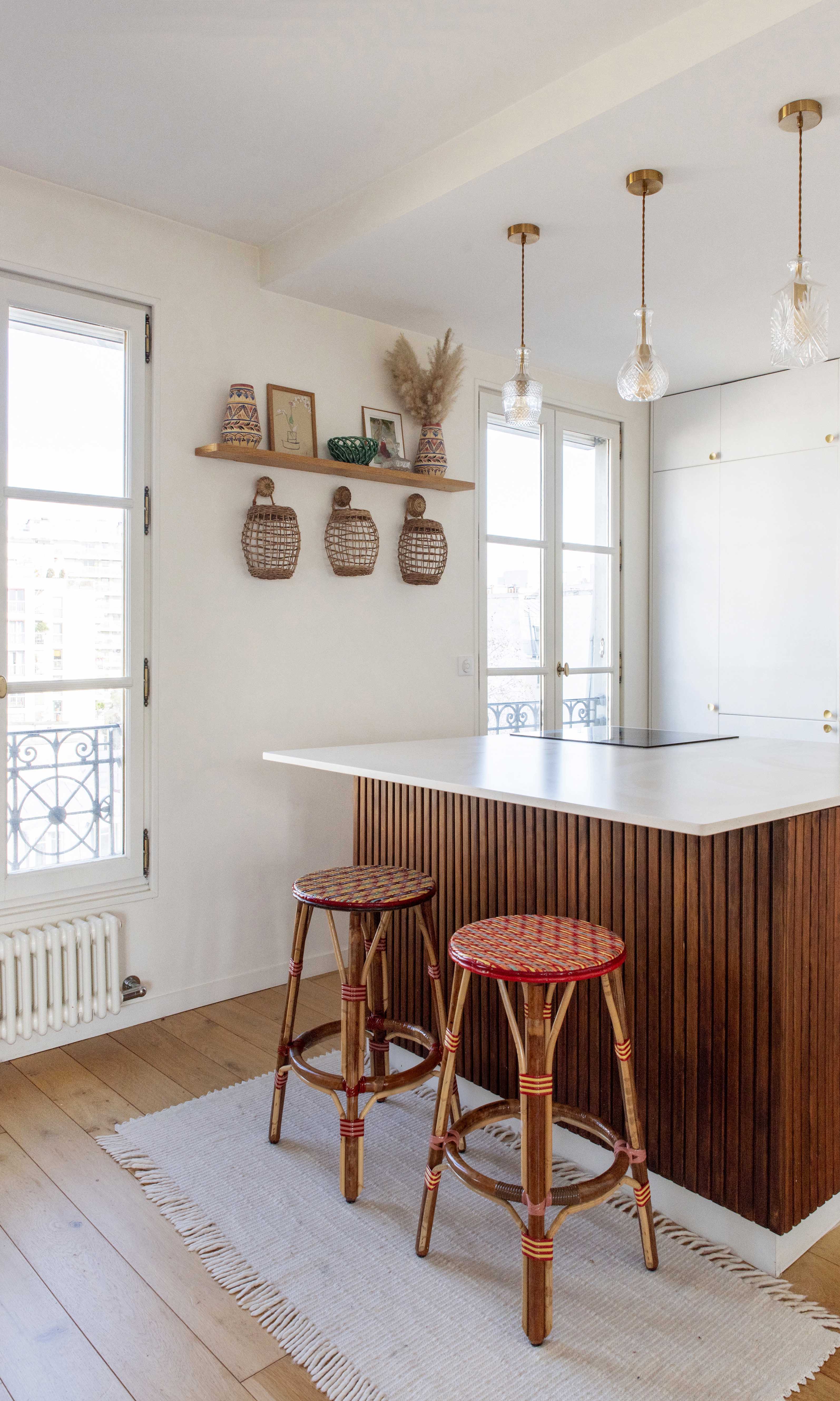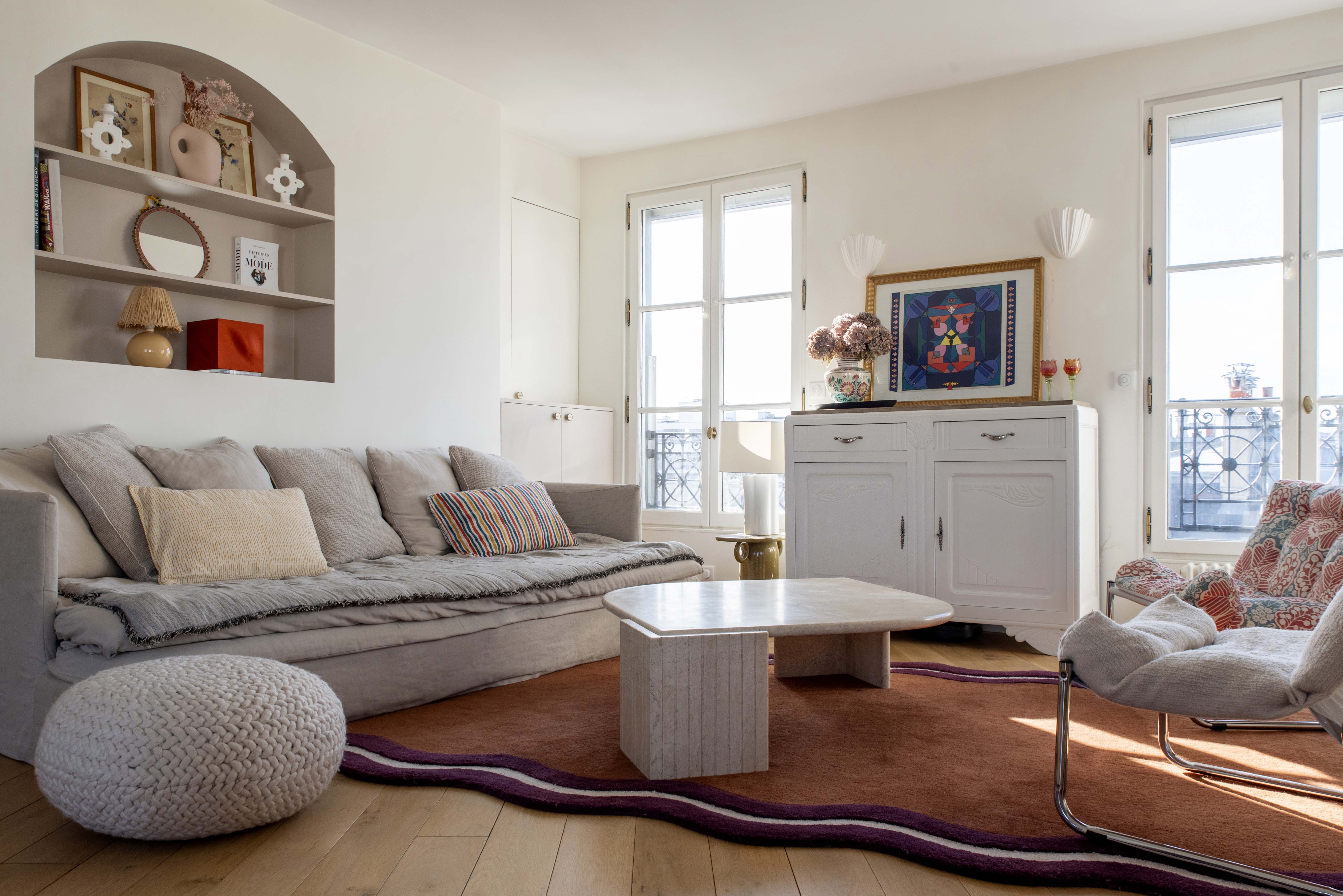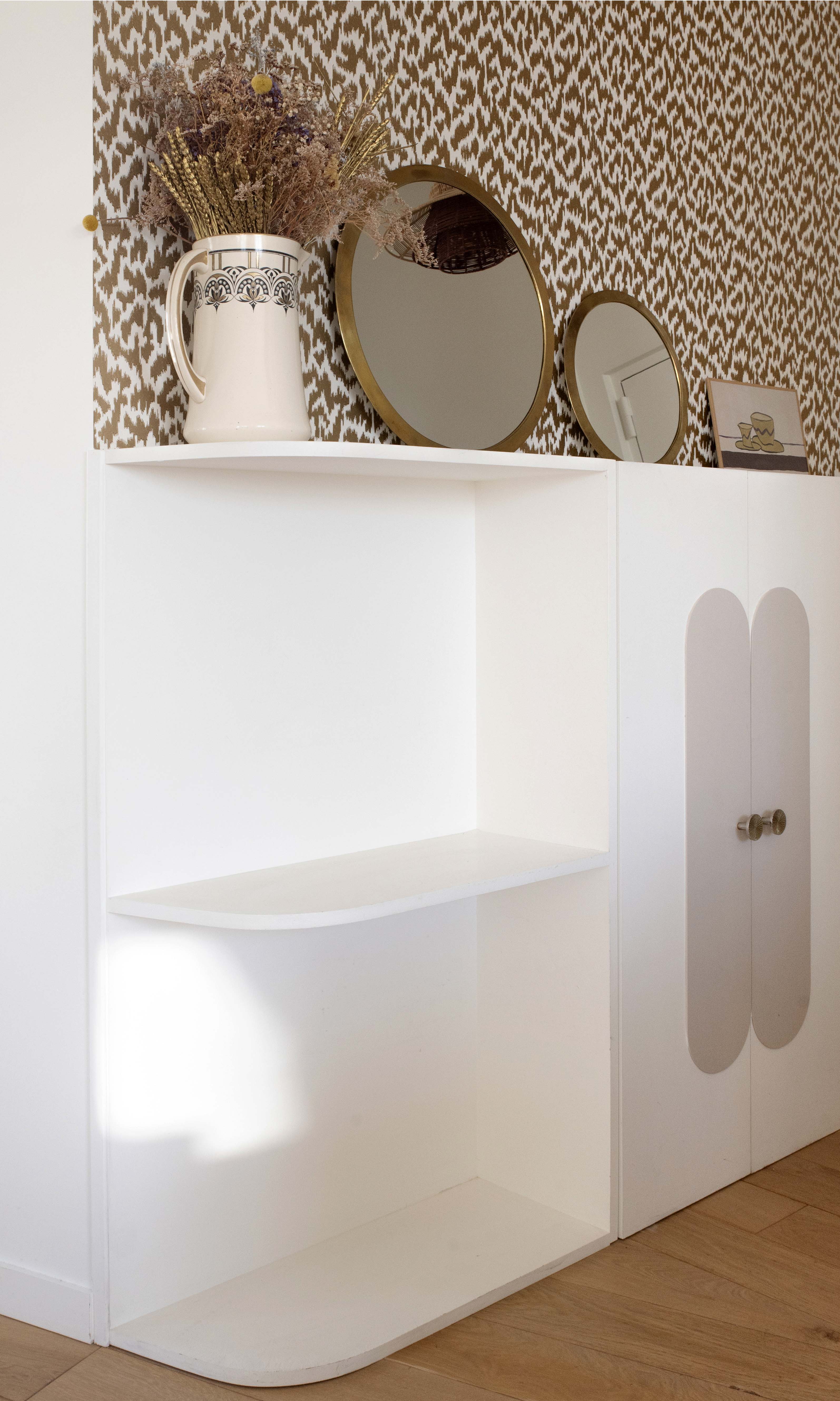 Les textures et les couleurs ont été choisies pour apporter de la douceur et de la cohérence. Les arrondis contribuent également à créer l’harmonie de l’appartement.