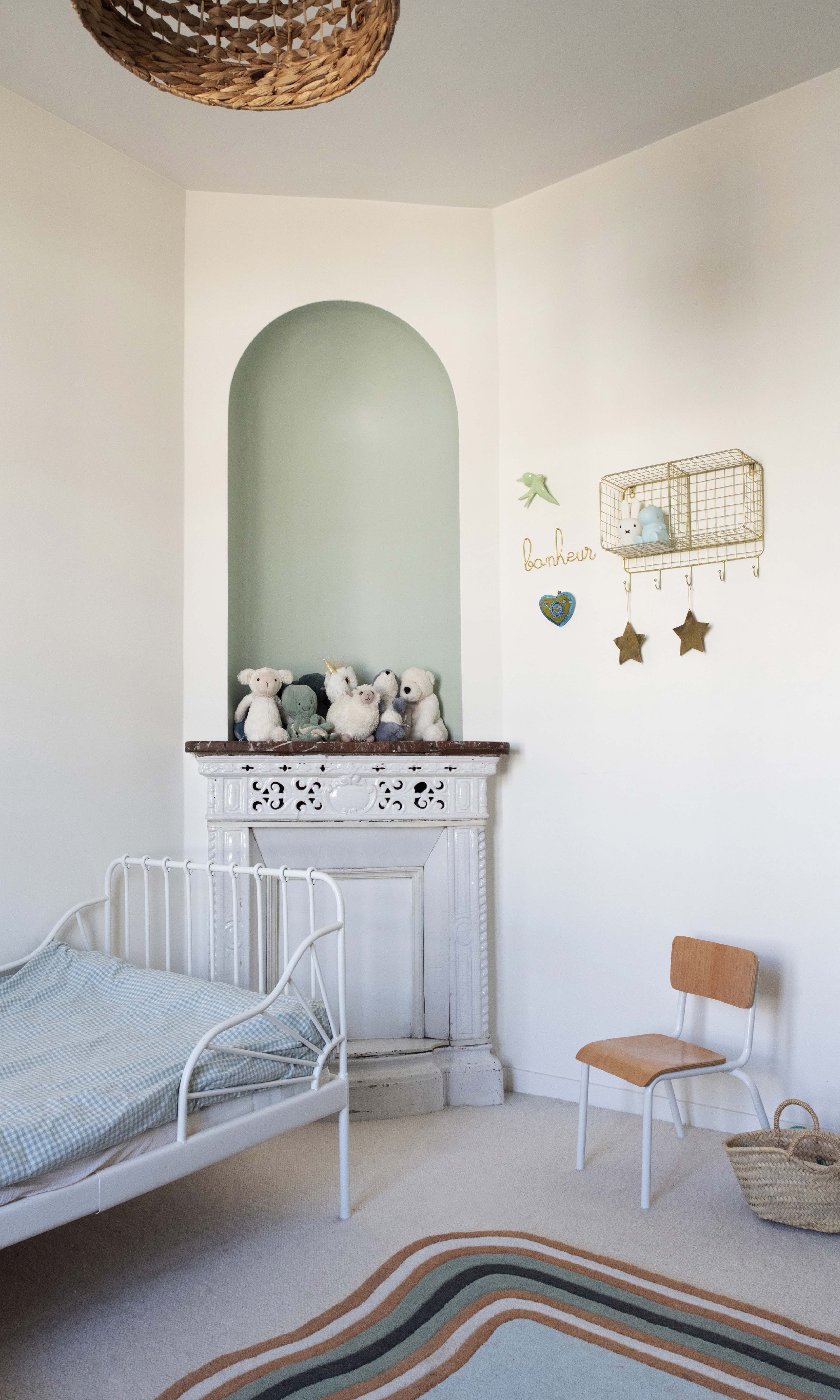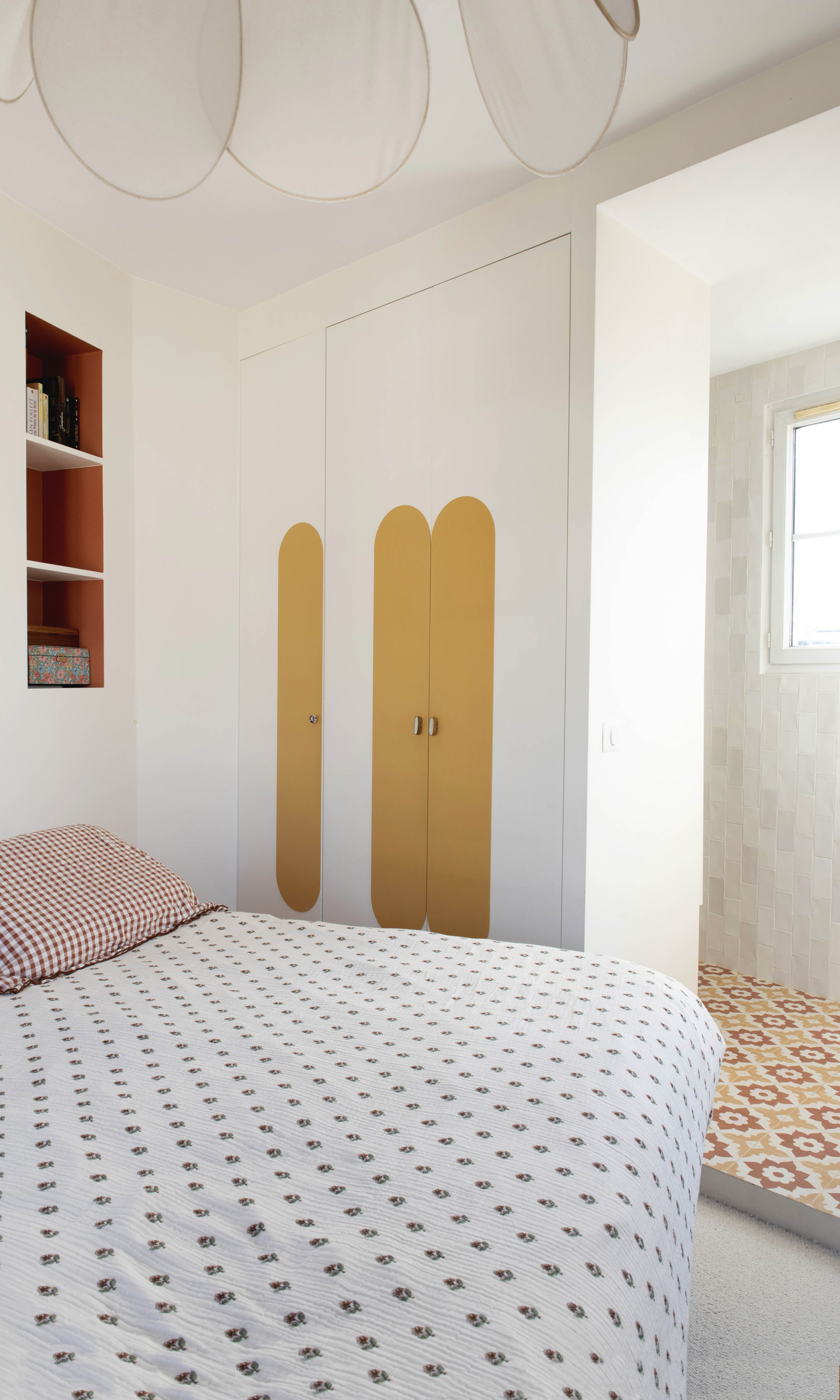 Les chambres d’enfants et leur salle de bains constituent une partie bien distincte. La création de la suite parentale a été réalisée dans l’angle de l’appartement, afin de bénéficier d’une vue directe sur l’église St Ambroise.
